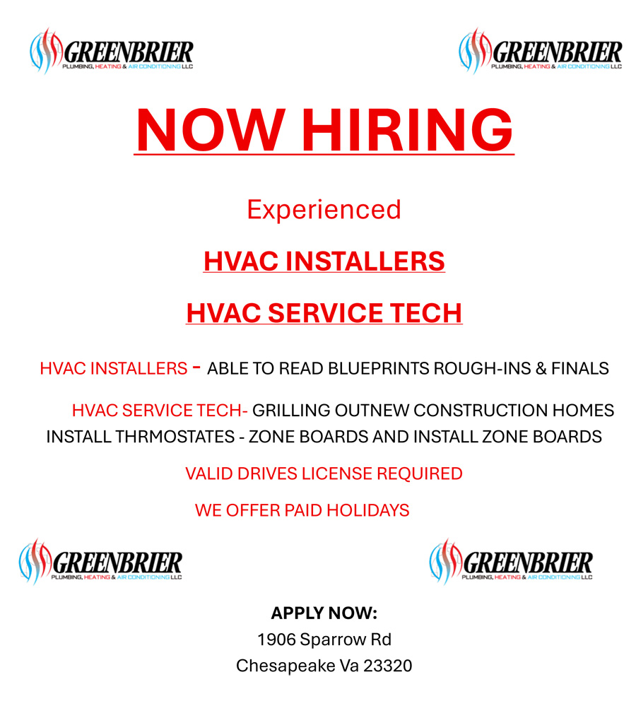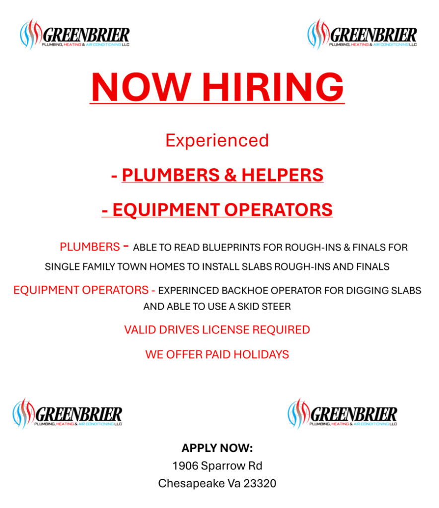 GREENBRIER PLUMBING IS NOW HIRING